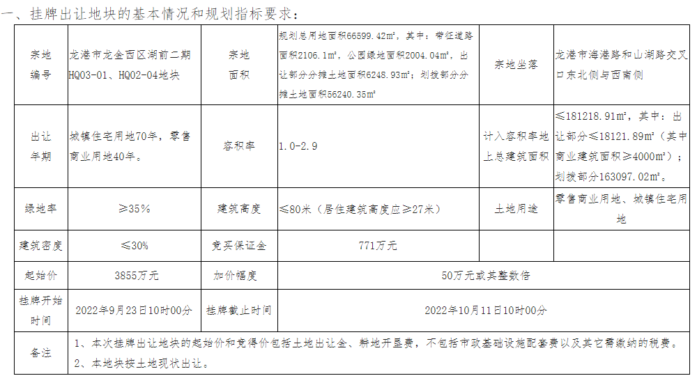 龙港市龙金西区湖前二期HQ03-01、HQ02-04地块规划总用地面积66599.42平方米(合99.90亩),其中带征道路面积2106.1平方米,公园绿地面积2004.04平方米,净用地面积62489.28平方米(合 93.73亩)。用地性质:居住用地兼容零售商业用地。计入容积率的地上总建筑面积≤181218.91平方米,其中沿街裙房应设置商业建筑面积≥4000平方米。其中出让分摊用地面积6248.93平方米,计入容积率的地上总建筑面积≤18121.89平方米;划拨分摊用地面积56240.35平方米,计入容积率的地上总建筑面积163097.02平方米,为瑞苍高速(龙港段)房屋拆迁和西桥社区返回指标安置用房。安置房位置位于HQ03-01、HQ02-04地块西侧方位,共计安置房面积163097.02平方米(其中90平方套型622套,共计55980平方米,用于西桥社区返回指标安置;90平方、120平方套型各148套,共计31080平方米,用于瑞苍高速拆迁安置;90平方、120平方套型各20套,共计4200平方米用于人才房;其他安置用房90平方及120平方套型342套共计71820㎡)。每套建筑面积允许误差为±2%,出让和划拨的分摊用地面积不随建筑面积的变化而调整。该地块出让成交确认后,出让分摊用地办理出让供地手续,土地使用权人为竞得人。安置房“四证”(不动产权证、建设用地规划许可证、建设工程规划许可证和施工许可证)委托竞得人办理;安置房分摊用地建设期的不动产权证、建设用地规划许可证主体为甲方,建设工程规划许可证和施工许可证主体为甲方和乙方。