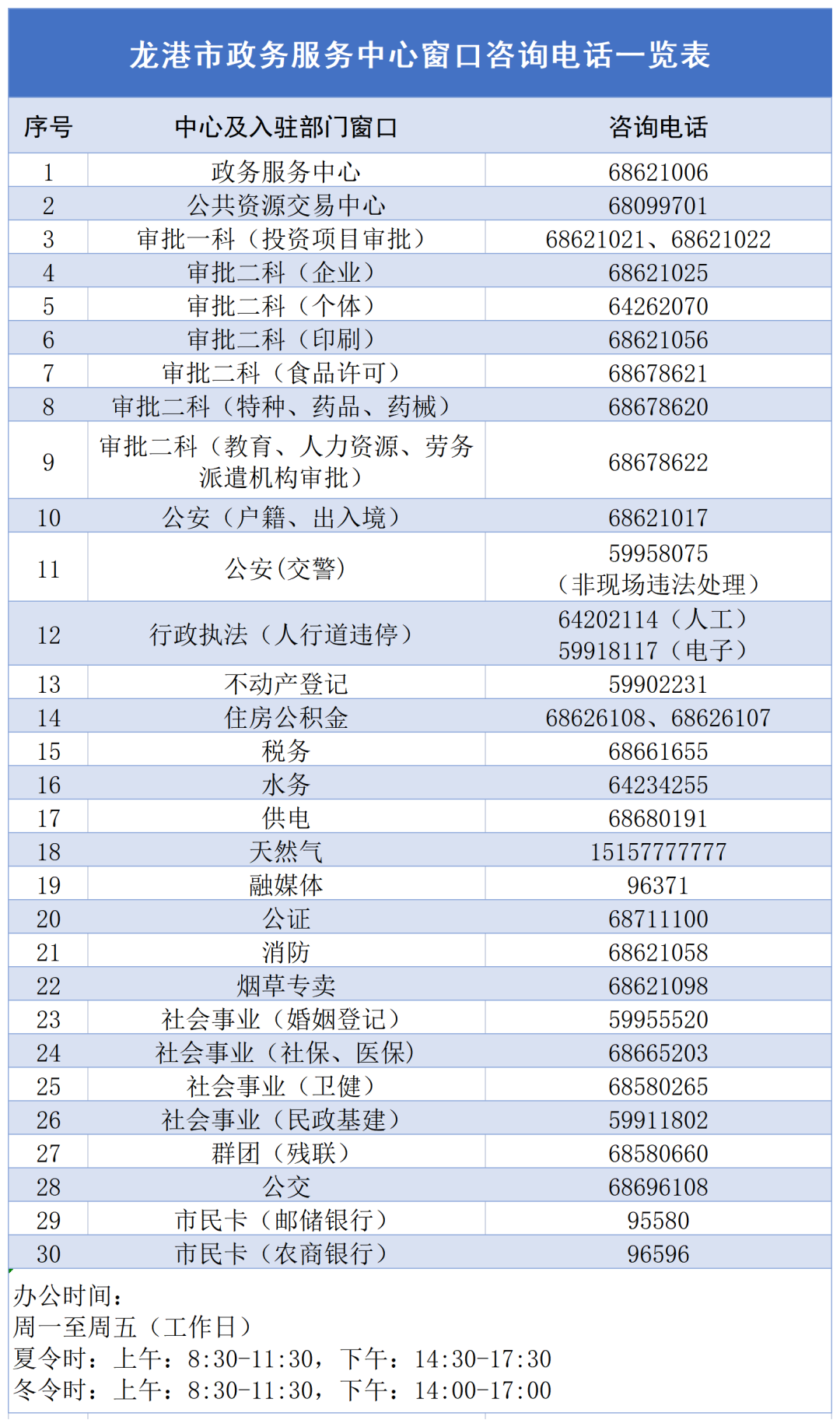 便民服务丨龙港市政务服务中心各窗口咨询电话公布