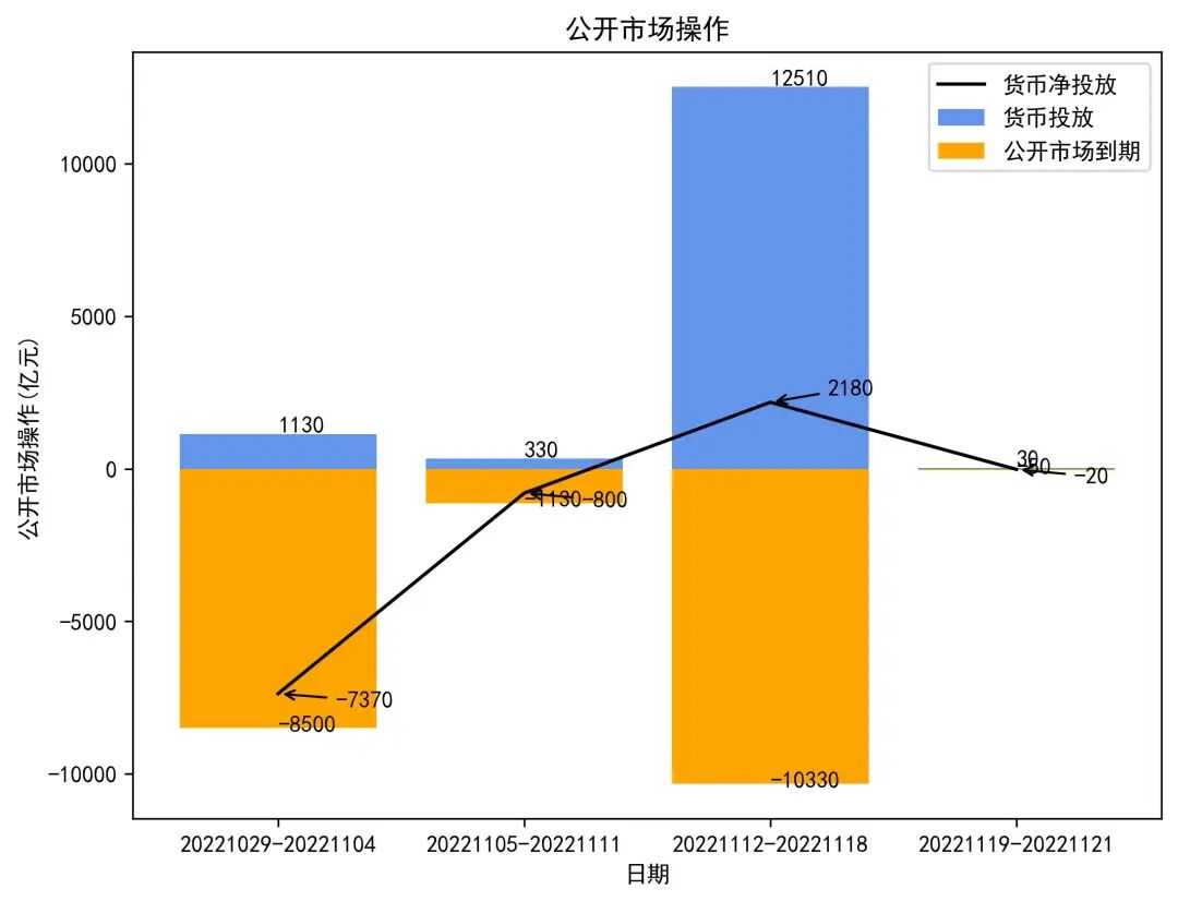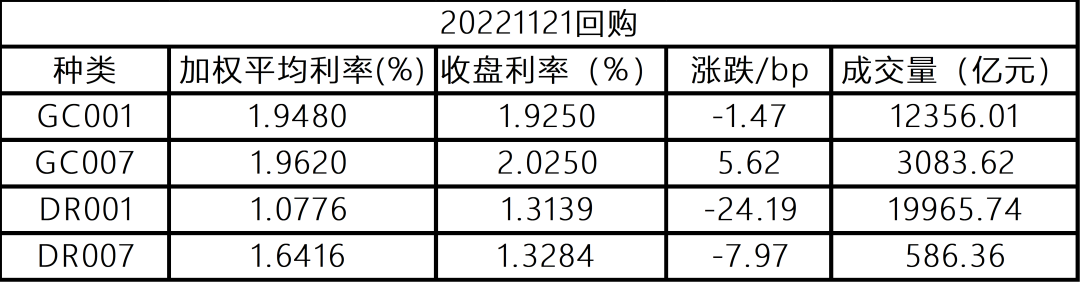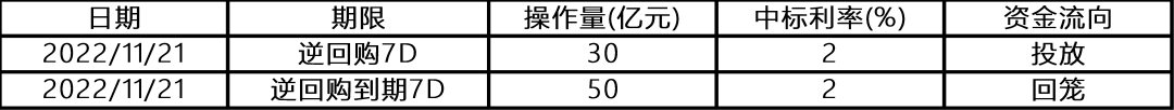 公开市场方面,人民银行公告称,为维护银行体系流动性合理充裕,2022年11月21日人民银行以利率招标方式开展了30亿元逆回购操作,中标利率2%。