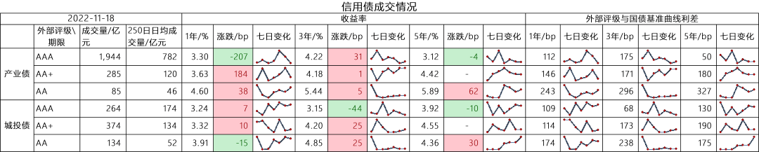 11月18日,评级为AAA的产业债和评级为AA+的城投债成交相对活跃。不同期限、不同类别信用债收益率涨跌互现。
