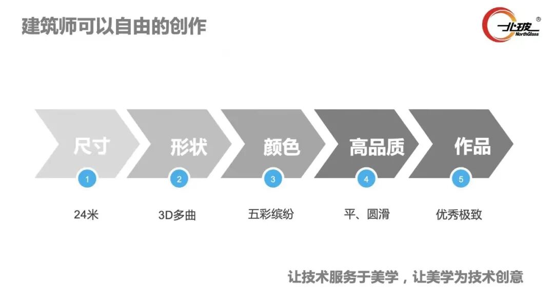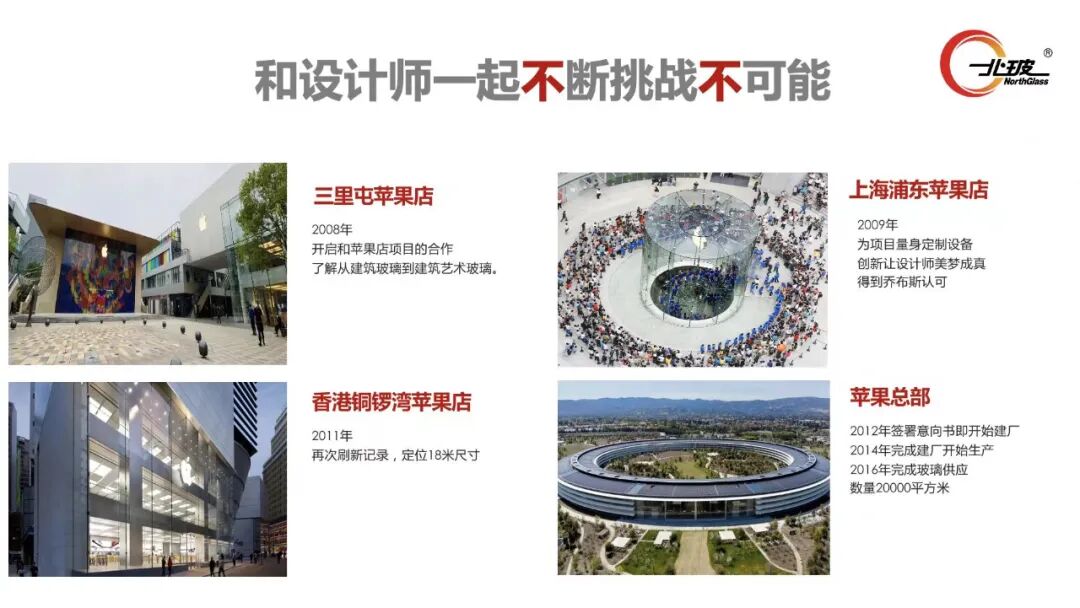天津北玻以通过不断创新持续提高中国建筑品质和拓展建筑玻璃品种技术为己任,和设计师一起不断挑战不可能,与国内外设计师、专家广泛积极互动为契机,为设计师和专家在建筑中关于玻璃的设计提供素材、经验和实现方法,使建筑玻璃真正成为业主、设计师、专家想要的外观品质和功能,为绿色、美丽、建筑做出外面的贡献。围绕苹果店玻璃的不断创新和挑战,从8.6m到18m;在全球100多个苹果店玻璃做到零自爆,在钢化玻璃平整度如何做到极致,中空玻璃将采用无缝交联长效密封系统,为更长使用寿命周期提供保证。其24m的超大玻璃、3D多曲玻璃,为设计师提供更多的创意空间。