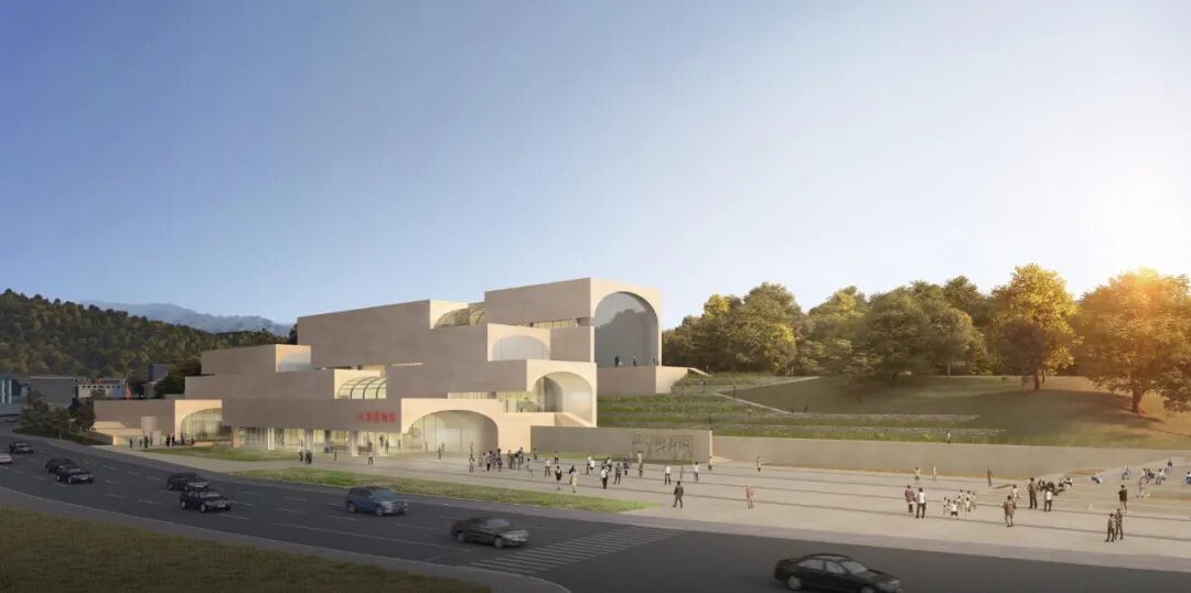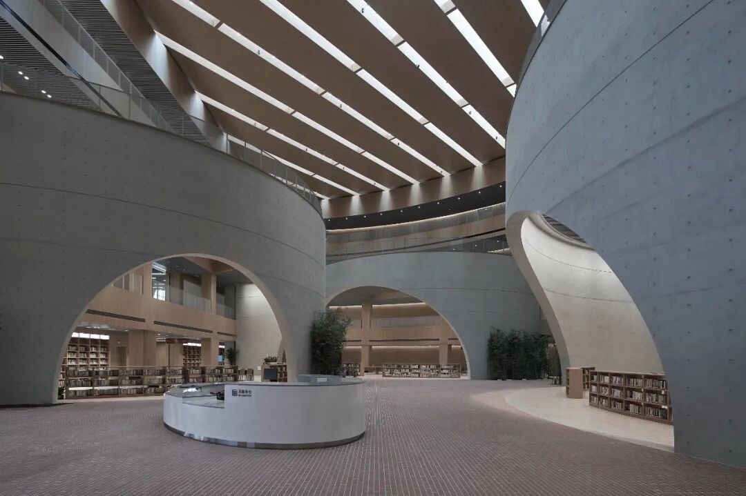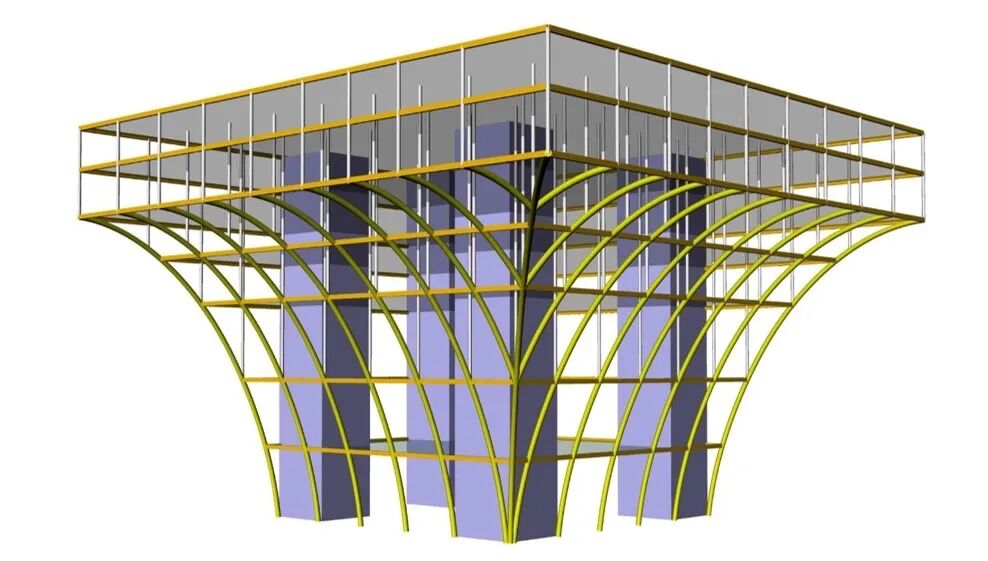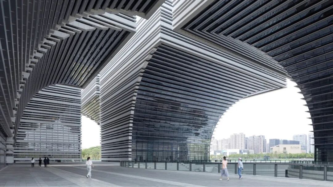 在经历八年的设计、施工后,常州文化广场于2020年建成。这个项目位于常州市中心,与市政府大楼遥遥相对并在同一轴线上。这座巨大的建筑综合体由六个相互独立的模块单元旋转组合,构成一组2x3的网格秩序。每个单元模块以自成体系的形式运作,分别提供美术馆、图书馆、酒店、办公空间其中一种功能用途。建筑主体结构由钢筋混凝土核心筒与钢结构框架组成,钢结构框架由核心筒两侧往对角方向逐渐向外悬挑。最初结构方案有两种思路,悬挑+悬挂,或者悬挑+拱柱,经过建筑师和结构师的深入研究,选择了后者。弧形拱柱将竖向力传递到下方区域,连梁将水平分力传递到核心筒。弧形拱柱将建筑造型、空间效果、构造逻辑完美结合起立。