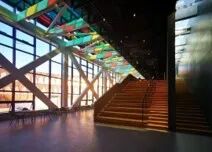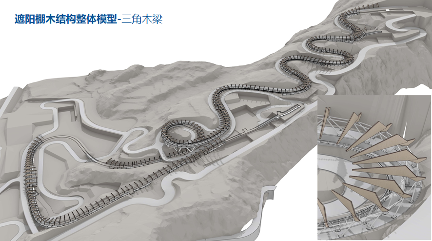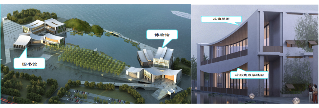 优秀的建筑作品需要建筑师和结构工程师的精巧配合得以完美实现,通过两个经典案例诠释如何通过巧妙的结构表达来实现建筑之美。北京2022年冬奥会雪车雪橇中心遮阳棚采用钢-木组合结构,屋面大悬挑部分采用胶合木实体异形梁,内设钢撑杆和拉索增强,底部设人字形钢柱的结构形式,既满足建筑功能和造型需求又充分发挥钢材抗拉和木材受压的优势。玉环博物馆、图书馆的反曲屋面不仅使建筑有着起伏美妙的轮廓线,在室内也形成了较大的无柱空间。屋面结构采用现浇缓粘结预应力悬索混凝土结构,楼面结构采用现浇鱼腹式箱形结构,以结构形成的下凹混凝土曲面直接构成建筑室内空间所需的混凝土质感曲面形态,真正实现了结构即是建筑亦是室内效果。