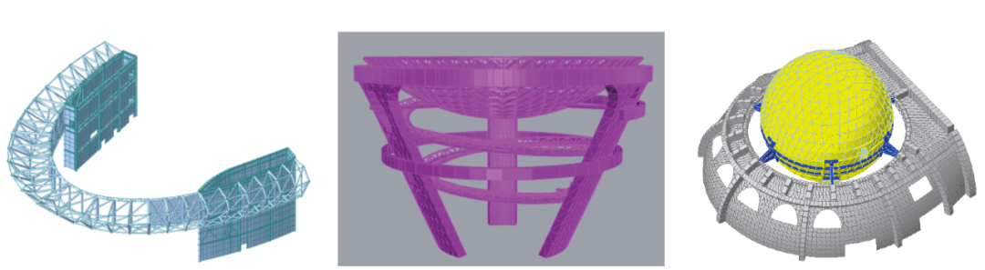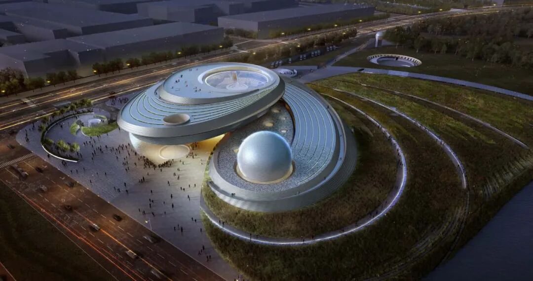 上海天⽂馆独特的形体源⾃建筑师对天⽂学概念的把握,将四时天象、⽇晷的体验表达与建筑,主要构成有三⼤圆形建筑元素,分别是圆洞天窗、倒置穹顶和球体,象征我们熟悉的“三体”—太阳、地球、⽉亮。结构设计围绕这三⼤元素,⼤⼿笔地采⽤⼤跨结构:⼤悬挑弧形钢桁架+混凝⼟核⼼筒体、三个巨型混凝⼟柱+两道环梁+倒置铝合⾦⽹壳、混凝⼟壳体+钢⽹壳。