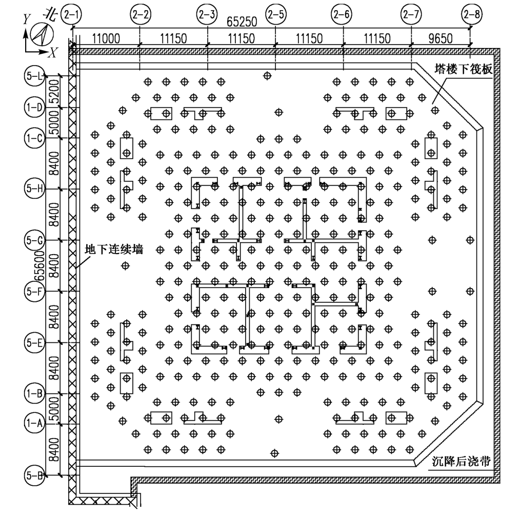 塔楼采用桩筏基础,筏板厚度为3800mm,钻孔灌注桩桩径为1000mm,以92-1层含砾中砂为桩端持力层,并采用桩端后注浆工艺,桩身强度等级为C45,单桩抗压竖向承载力特征值为11000kN,有效桩长66m。塔楼下筏板采用C50混凝土,厚度为3800mm。