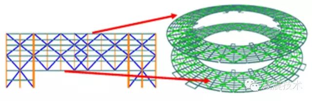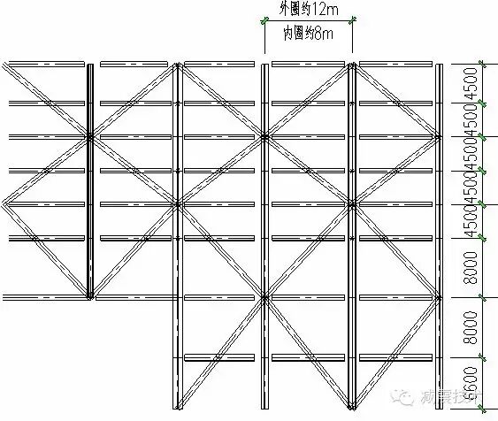 内、外圈支撑筒立面展开图见图6。支撑杆件跨2层连续布置,斜杆倾斜角度为37~62°。内圈斜撑与建筑门洞矛盾处设置钢板墙,根据受力大小,钢板厚度取20~40mm,钢板墙位于建筑造型之后,不影响建筑立面效果。