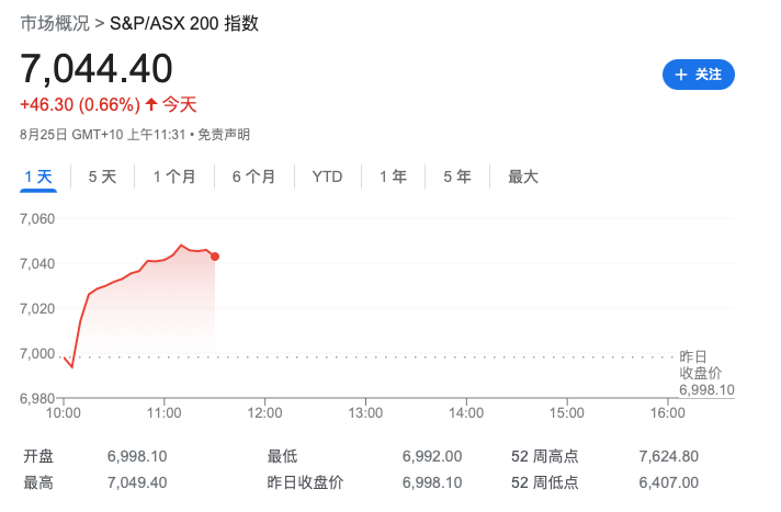 至上午11时30分前后,澳股ASX200指数上涨46点,至7044点,涨幅为0.66%。