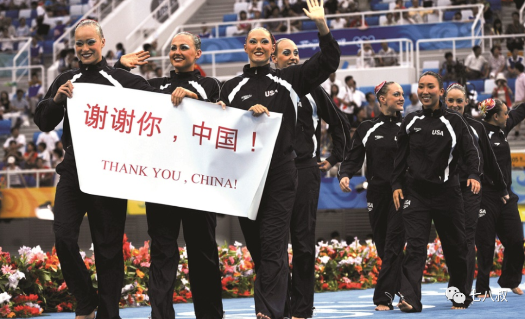 △2008年8月23日,美国花样游泳女子团体选手入场时打着“谢谢你,中国!”的标语向观众致意。