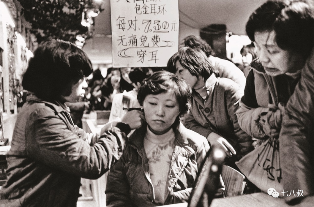 △1984年的广东广州,首届“美在花城”时装博览会,卖包金耳环的摊档上围了几层女同胞,她们在看店主给顾客穿耳洞。