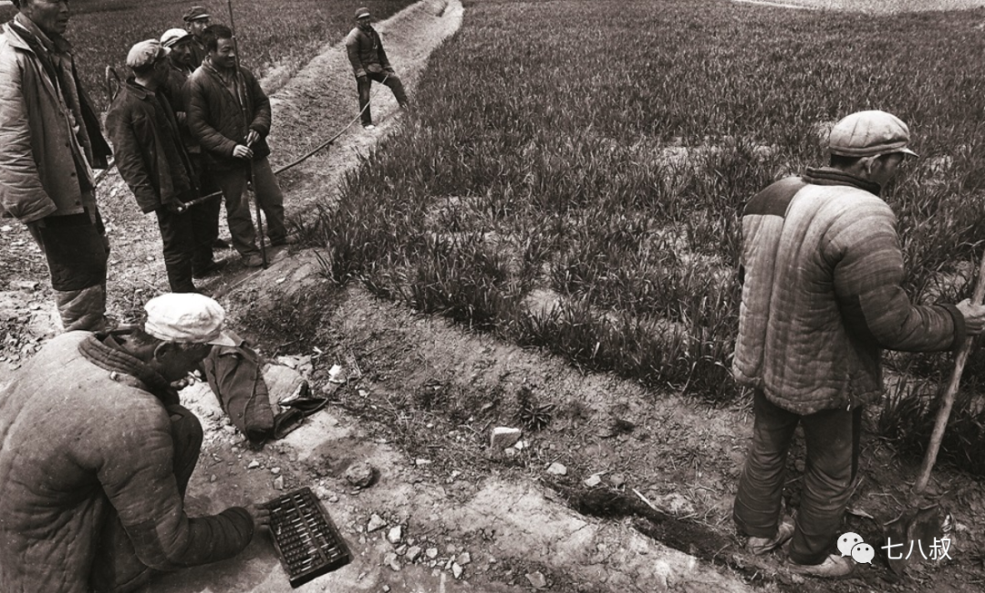 △1980年山东沂水某生产队在丈量土地,分给农户。