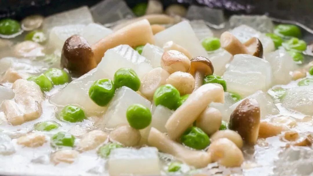 4、出锅前,撒上青豆略煮几分钟,勾一层薄芡,加入一点点盐和白胡椒调味即可。