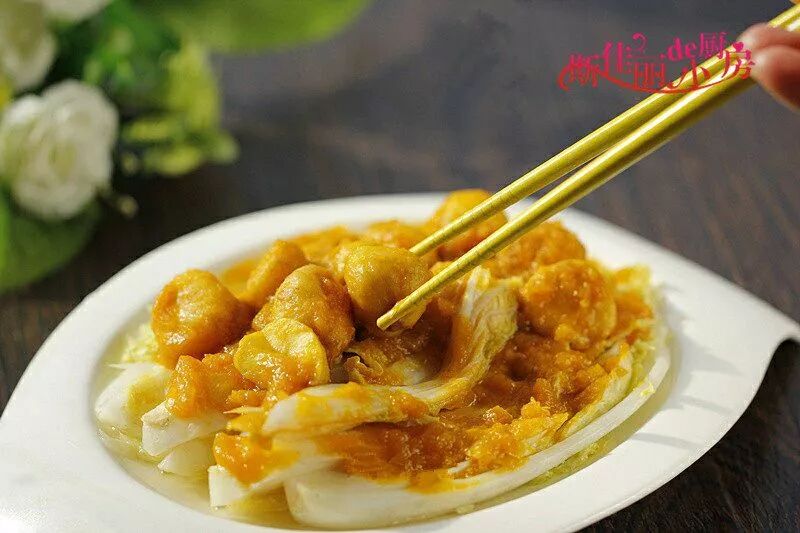 8、最后将板栗南瓜汁浇淋在娃娃菜上