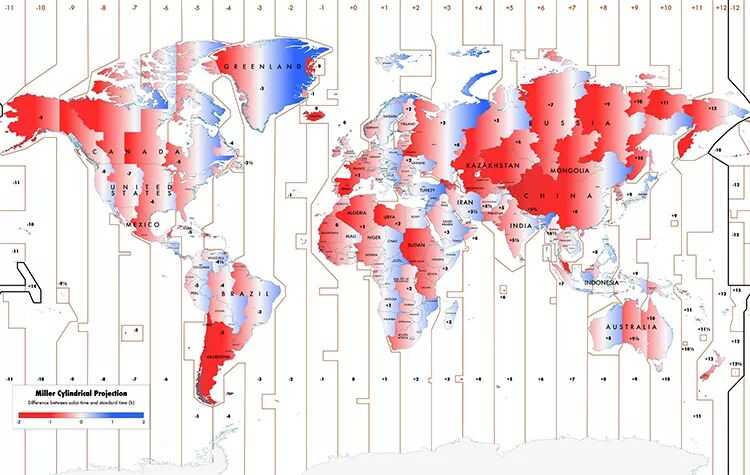 In the map above, the white-colored spaces represent areas that accurately represent "solar time." That is the time as measured by a sundial - the sun is highest in the sky at noon, with more or less equally long periods of sunniness in the morning and the afternoon/evening. In the red areas, the time is a bit late - the sun may peak in the sky at 1pm, for example. And in the blue, it's early - the sun could be highest at 11:30am.