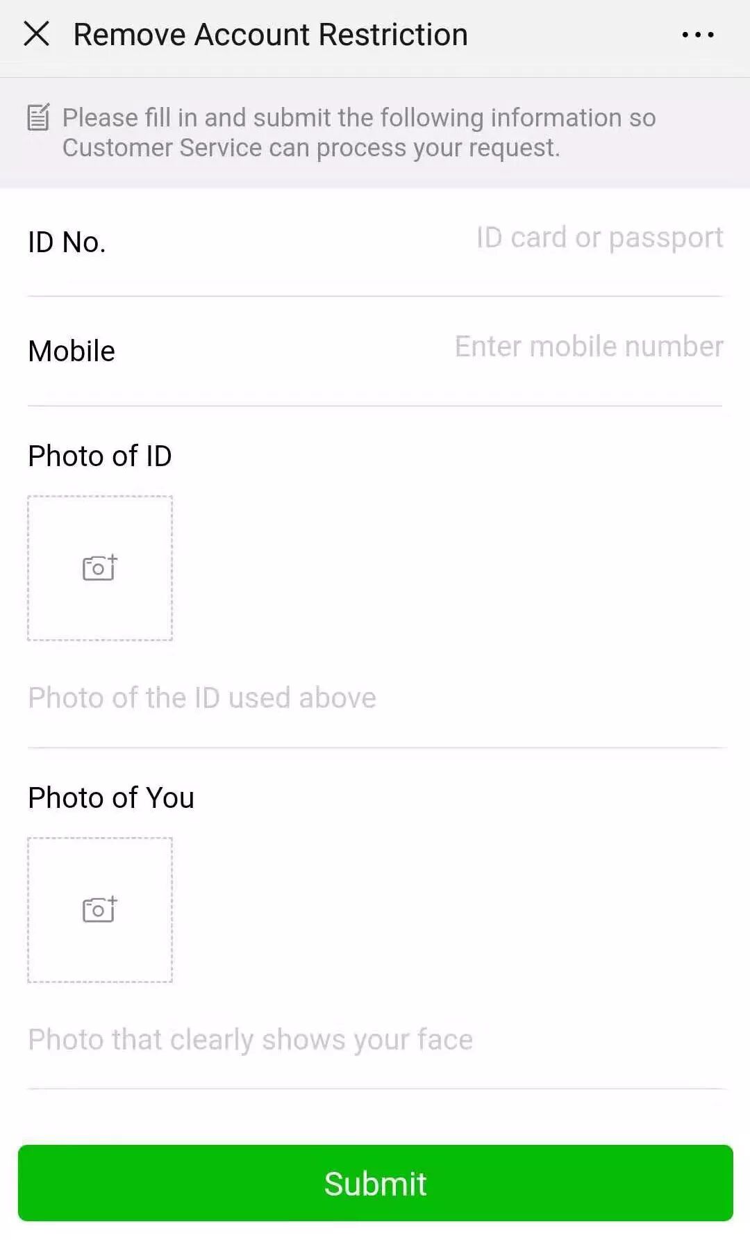 This message may appear in your WeChat Pay transactions list, saying the account holder needs to update their personal information in order to remove the account restriction. Click ‘check details’ to upload your information and regain function of WeChat Pay.