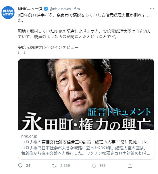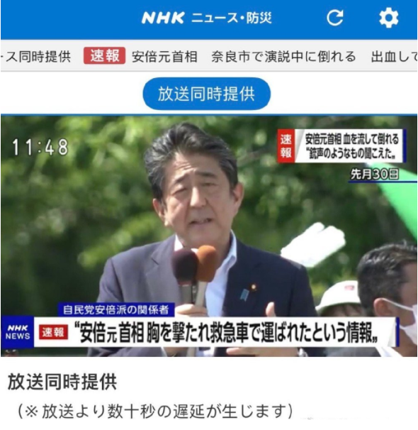 日本前首相安倍晋三在奈良市进行演讲时胸部中枪,