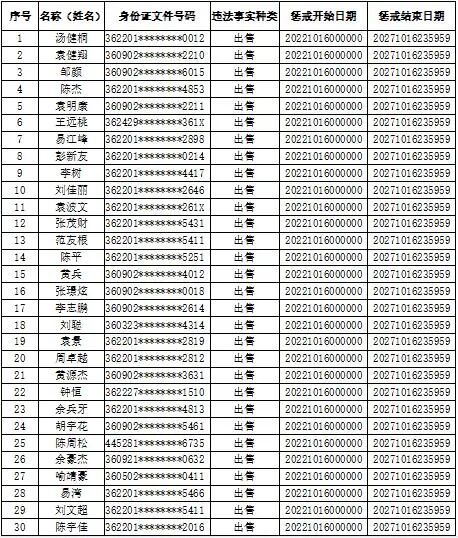 近年来,宜春市袁州区部分人员受利益驱使,向不法分子出售、出租、出借自己名下的银行卡、电话卡,用于电信网络诈骗等违法犯罪活动,对社会造成巨大危害。2020年10月10日全国开展“断卡行动”以来,宜春市公安局袁州分局严厉打击整治贩卖银行卡、电话卡违法犯罪活动,随着“断卡行动”的推进,经分局认定,对以下30人实施5年内暂停银行账户非柜面业务、支付账户所有业务,并不得新开立账户的惩戒措施。