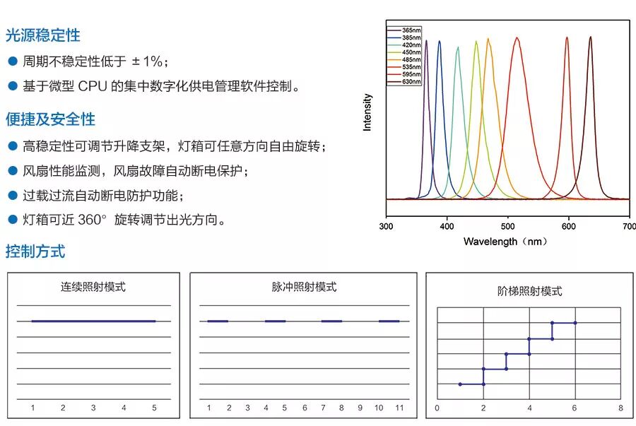 ● 输出方式多样,具有连续、脉冲及阶梯三种辐照模式;