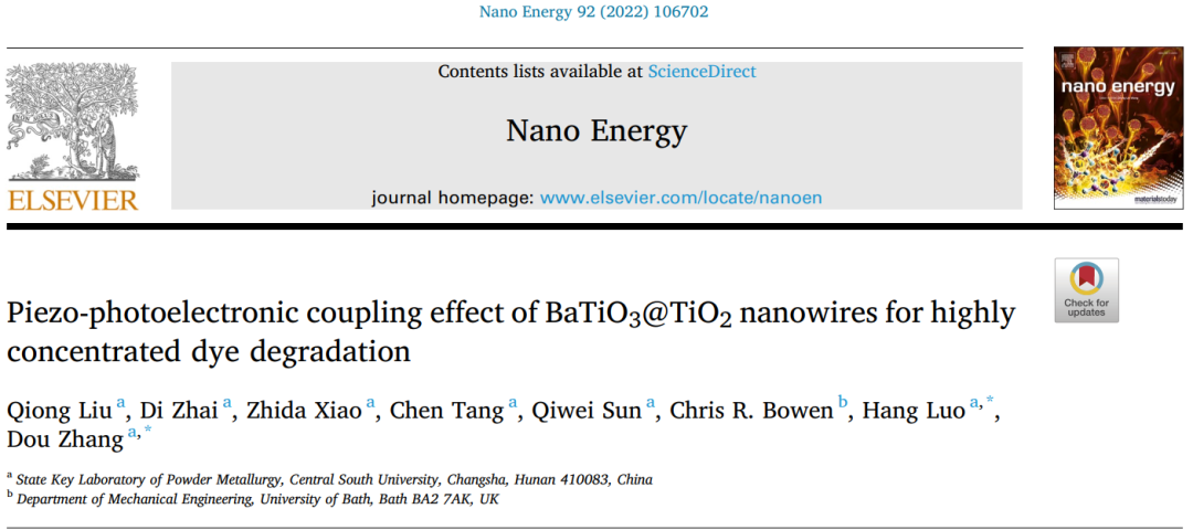2020年11月,Nano Energy 杂志在线发表了中南大学张斗教授团队在压电光催化领域的最新研究成果。该工作报道了BaTiO3@TiO2纳米线光电-压电协同催化降解多种高浓度染料的作用机制。论文第一作者为:中南大学博士研究生刘琼,论文共同通讯作者为:张斗教授以及罗行副教授。