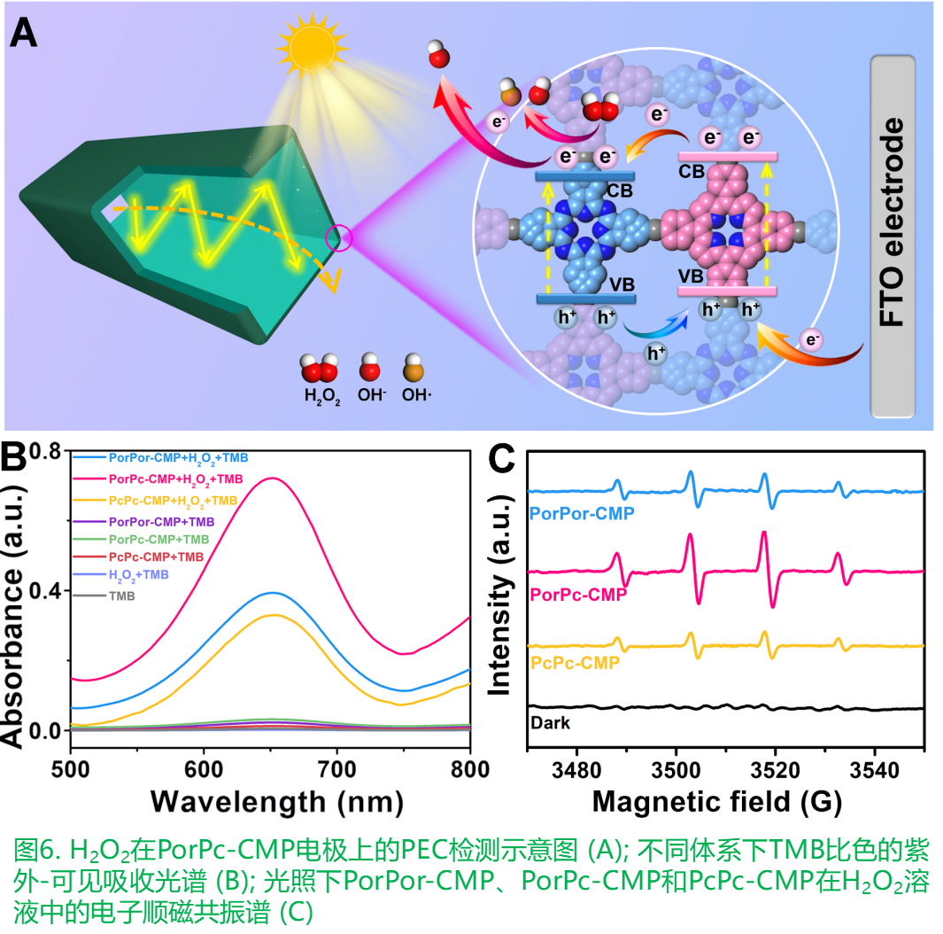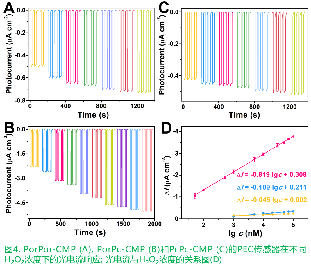 2021年11月,Journal of Materials Chemistry A 杂志在线发表了中国石油大学(华东)陈艳丽教授团队在光电化学传感领域的最新研究成果。该工作报道了基于有机共轭微孔聚合物用于H2O2和葡萄糖特异性检测的高性能光电化学传感。论文第一作者为:孙琦琦、刘琪,论文共同通讯作者为:陈艳丽教授、张跃兴教授。近年来,多种n型半导体被广泛应用于抗原、葡萄糖和重金属离子的阳极-PEC检测。但在实际应用中,n型半导体材料作为光阳极易受到还原性物质竞争反应的干扰。相反,基于p型半导体的光阴极可以抑制光阳极界面发生的本征空穴氧化反应,拓宽了PEC传感器的应用范围。在众多的光阴极材料中,卟啉/酞菁及其衍生物因其具有高吸收系数、超快的电子注入和缓慢的电荷重组等优点而被关注,但催化剂组成不可控、光腐蚀严重、电荷输运效率低等缺点阻碍了其应用。幸运的是,光敏共轭多孔聚合物(CMPs)由于它们在二维平面上扩展的共轭结构和周期性垂直的π-π堆积,使其为光热性能提供了稳定性和电荷转移能力。并且,CMPs的特殊结构单元更适合于研究光电反应的机理。