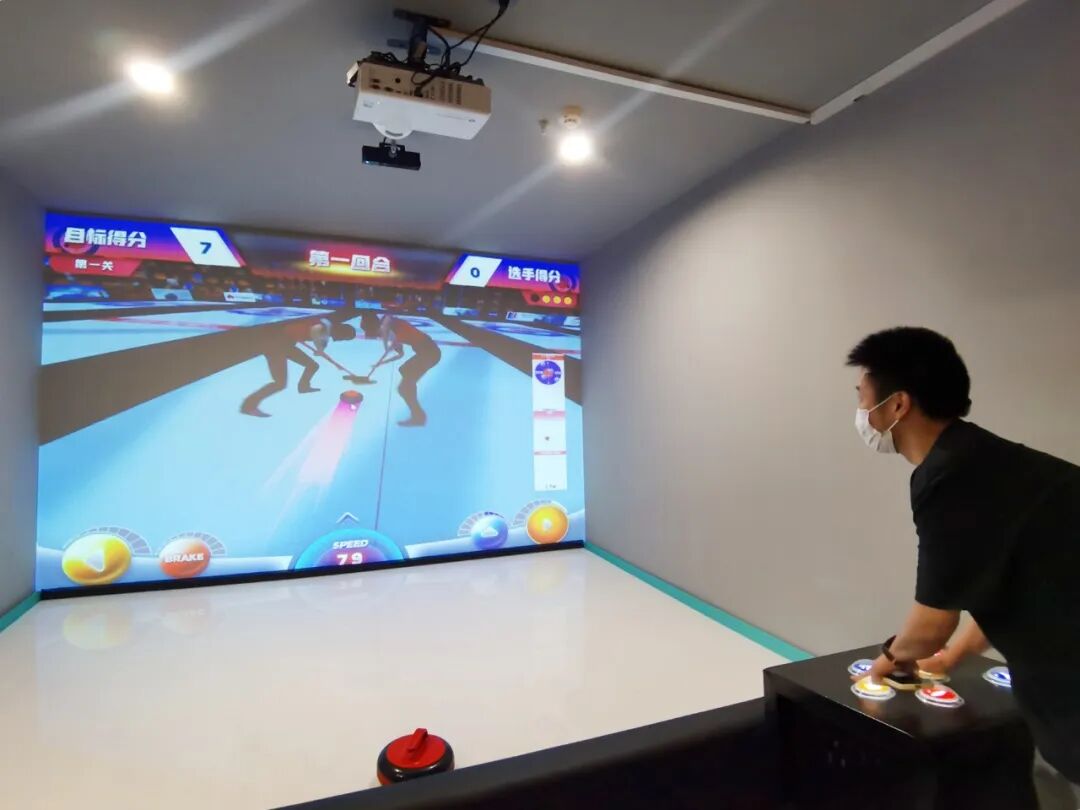 冰壶游戏是上海少有的体验项目,大屏幕可还原竞技场景,开局时需推动前方的真实冰壶,仪式感满满。项目支持单人模式及双人对战,过程中使用按键即可操控电子冰壶。