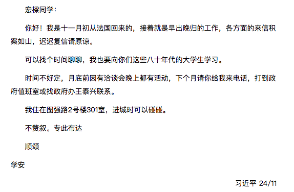 就这样,开学后我就带着这封信回校,没敢寄也不敢直接去送,于是我就给习近平同志写了一封信,大意就是想把这封信交给他,同时也很期待能与这位在正定老百姓中口碑很好的年轻领导干部见上一面,汇报一下自己的大学生活,希望得到他的指导。信封上写的是:厦门市政府办公室,习近平同志收。信发出后,压根儿没想到会收到他的亲笔回信。这让我感到很惊喜,也很感动。