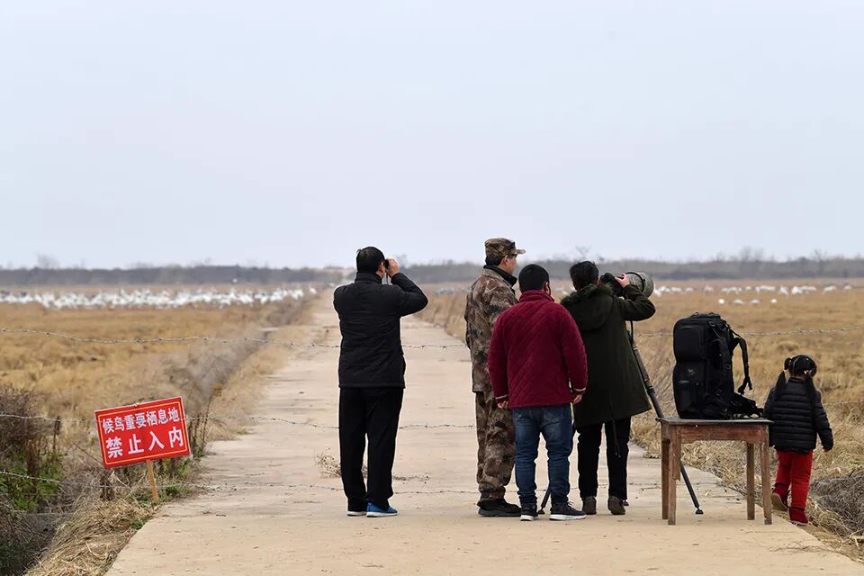 2021年1月,鄱阳湖畔的江西省余干县康山垦殖场,候鸟巡护队队员设置了保护围栏,观鸟人士只能在围栏外观鸟。不干扰鸟类是观鸟人的共识。 (新华社/图)