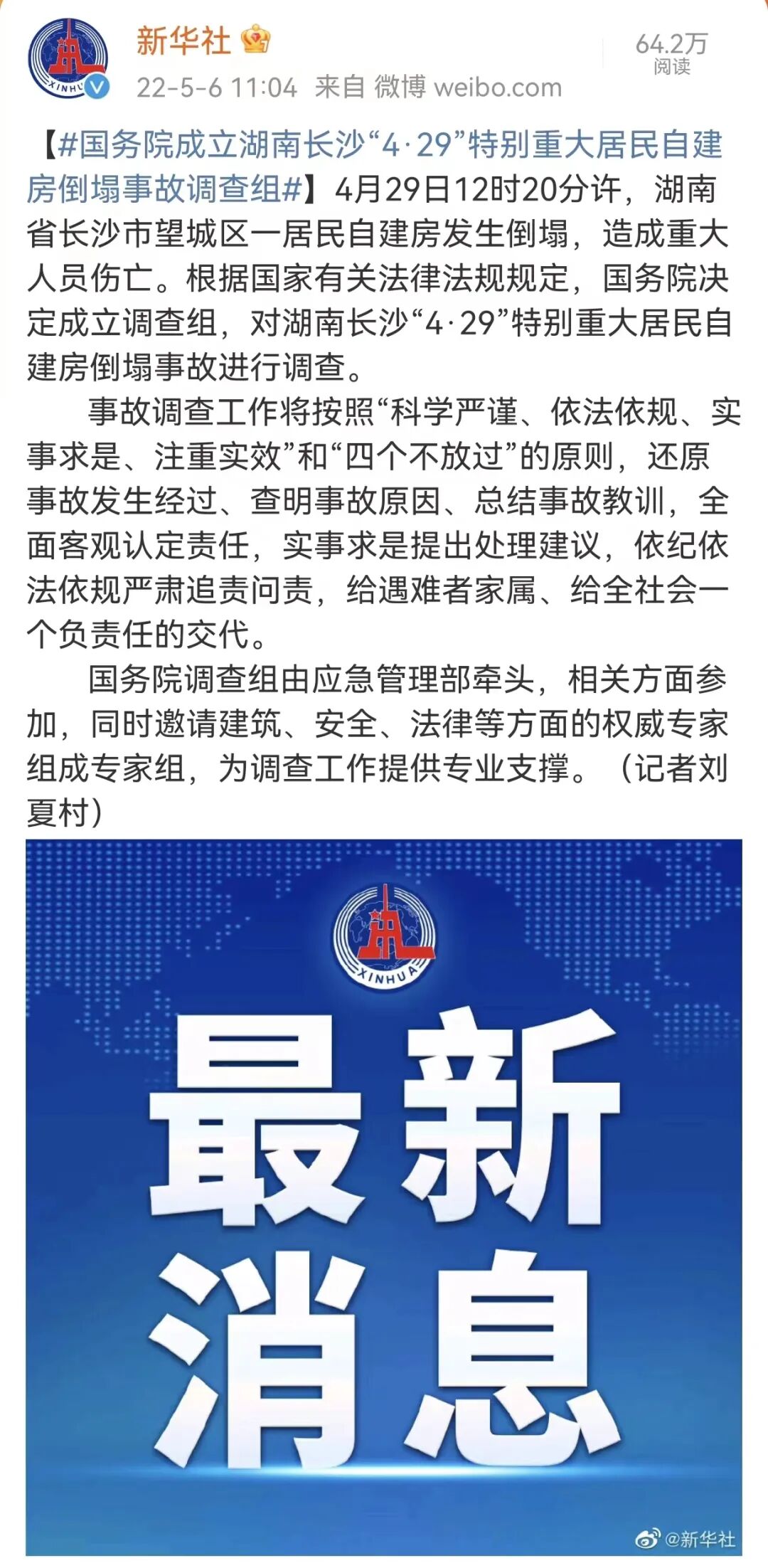 国务院成立湖南长沙“4·29”特别重大居民自建房倒塌事故调查组