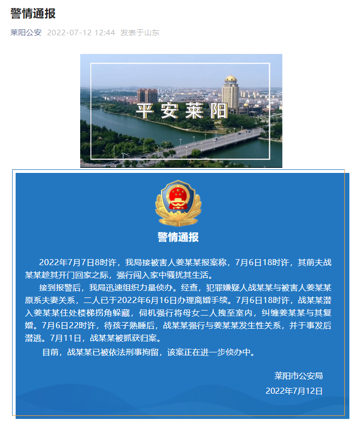 近日,一段疑似母女被男子拖进屋内的监控视频在网上流传,引发广泛关注。7月12日,山东莱阳公安局通报:2022年7月7日8时许,该局接被害人姜某某报案称,7月6日18时许,其前夫战某某趁其开门回家之际,强行闯入家中骚扰其生活。接到报警后,该局迅速组织力量侦办。经查,犯罪嫌疑人战某某与被害人姜某某原系夫妻关系,二人已于2022年6月16日办理离婚手续。7月6日18时许,战某某潜入姜某某住处楼梯拐角躲藏,伺机强行将母女二人拽至室内,纠缠姜某某与其复婚。7月6日22时许,待孩子熟睡后,战某某强行与姜某某发生性关系,并于事发后潜逃。7月11日,战某某被抓获归案。目前,战某某已被依法刑事拘留,该案正在进一步侦办中。![]()