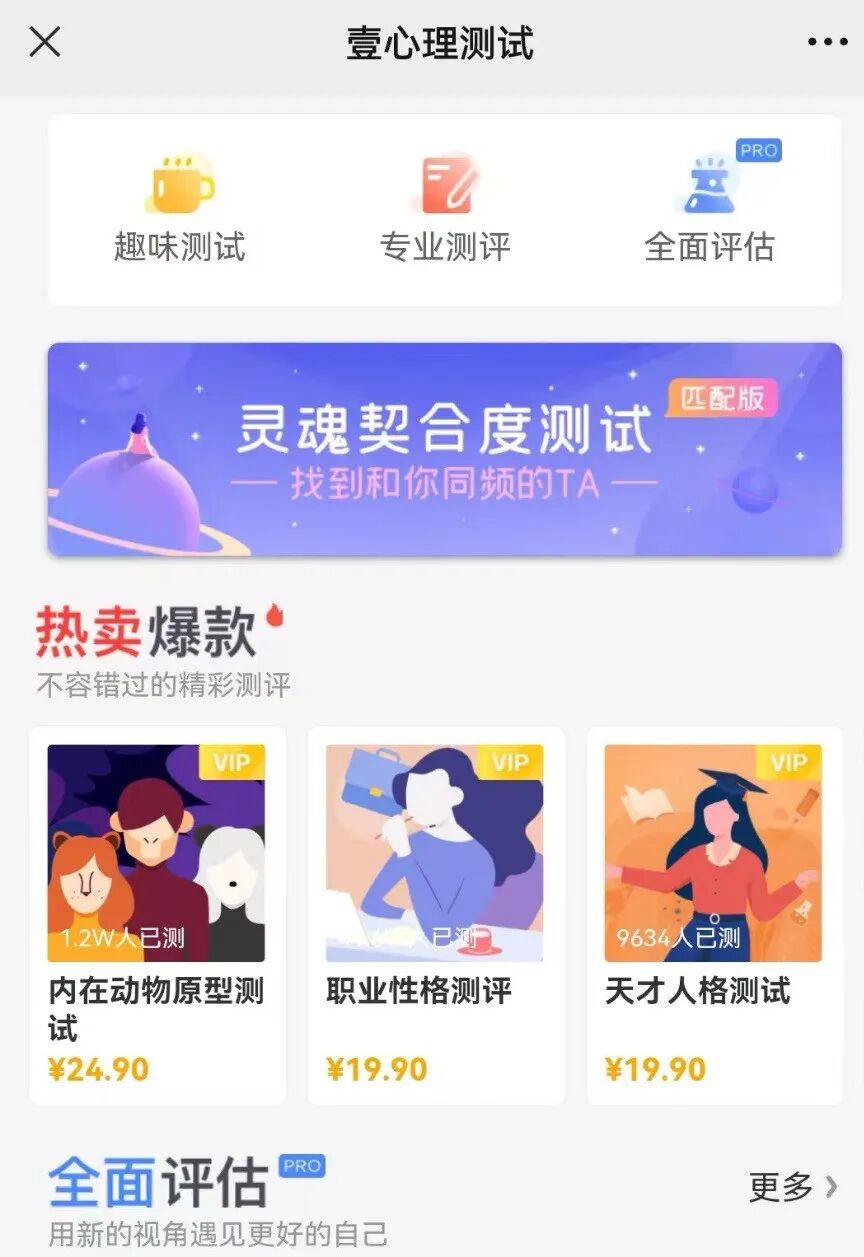 壹心理旗下的“壹心理测试”公众号,包含了各种类型的测试,爆款测试包括潜意识性爱测试、黑色生命力测试、职业性格测评等。除小部分测试免费之外,其他收费区间在9.9元到几十元不等。