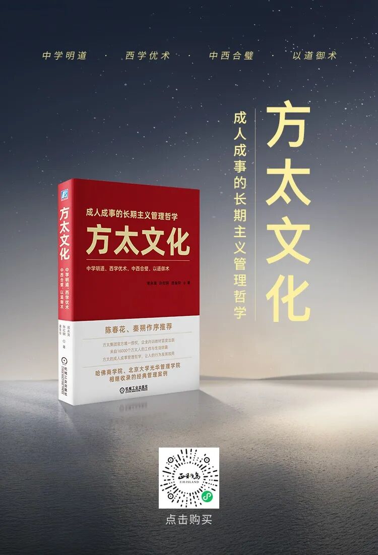 今年1月,方太企业管理哲学之作《方太文化》正式对外发布。本书作者遍访上百位方太高管和员工,写作历时两年,收集整理百万字企业原始素材,多角度完整展现了方太的经营理念、基本原则和践行体系。为企业文化管理提供可借鉴范本。如何将务虚的文化转化为务实的经营之道,在《方太文化》一书中得以窥探一二。点击下图购买《方太文化》,让我们一同领略成人成事的长期主义管理哲学。