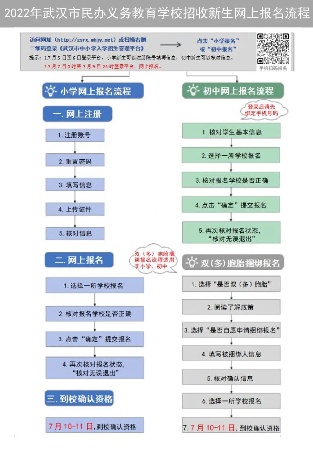 选择小学且已完成网上报名的新生,须于7月10-11日到学校确认资格。本市户籍人员携带户口本原件和复印件,非武汉市户籍人员携带居住证、户口本原件和复印件等资料;为提高审核效率,建议携带《义务教育入学通知书》。