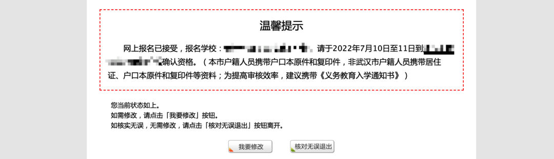 4.在上图报名状态页,再次核对报名状态。如需修改报名学校,点击“我要修改”按钮进行修改;如核对报名状态无误不修改,请点击“核对无误退出”按钮退出本次操作并注销登录。
