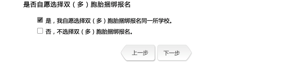 上一步骤勾选“同意”的,点击“下一步”后,系统将提示:“是否自愿选择双(多)胞胎捆绑报名”,在选项中进行勾选,点击“下一步”,勾选“是”将继续进行双(多)胞胎捆绑报名,勾选“否”将返回普通报名。