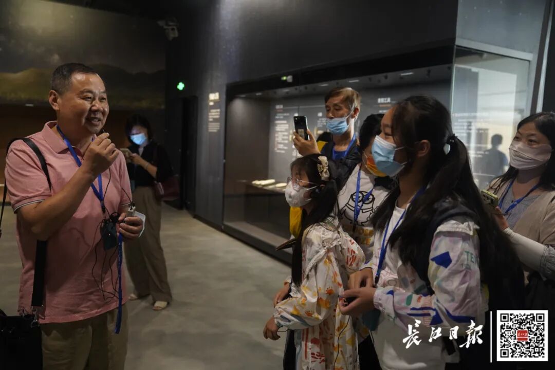 随团探访的湖北省文物考古研究院研究员、湖北理工学院长江中游矿冶文化与经济社会发展研究中心教授陈树祥为孩子们答疑解惑:“青铜大圆鼎”是博物院的镇馆之宝,我们又称它“铜之神”。它高85厘米,口径也有55厘米,是盘龙城遗址也是全国商代出土青铜圆鼎中最大的。