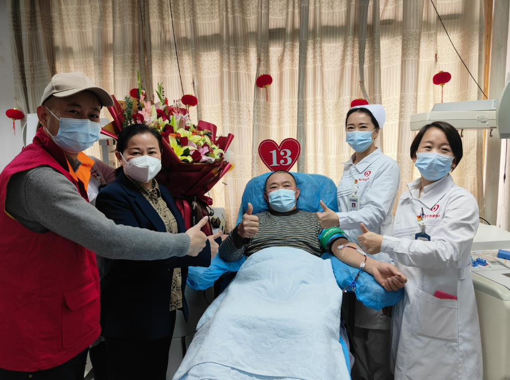 成分献血科业务督导陈涵薇、副主任谢松丽、谢晋及秦义无偿成分献血感召队队长秦义为李光明送上祝福。肖莉娇 摄