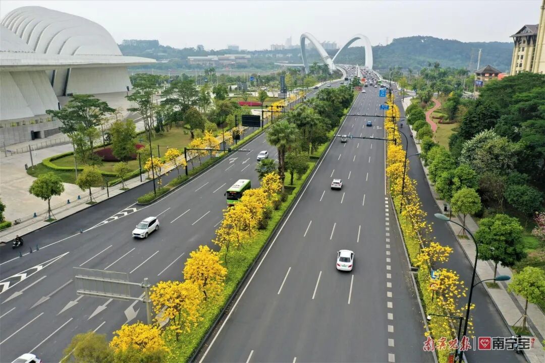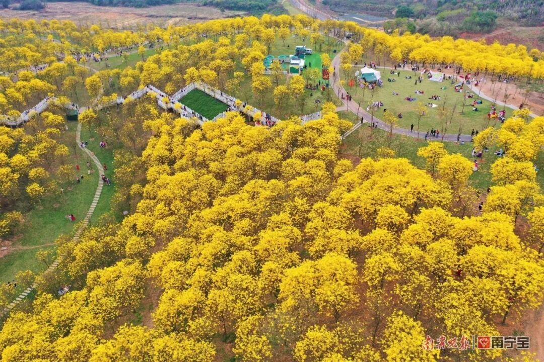 清风吹动,风铃叮咛,轻叩我心。三月的花,怎能少得了“满城尽带黄金甲”的黄花风铃木呢?近年来,南宁市不断加大花化、彩化、香化力度,漫步各大公园景区、街边道路、口袋公园……抬头就能看到那一抹明艳艳的金黄色,如江南公园有上万株黄花风铃木,青秀山东门风铃谷花开正艳,五象新区总部基地周边的秋月路、庆歌路的黄花风铃木进入盛花期,为沿途增添了一道道赏心悦目的风景线。