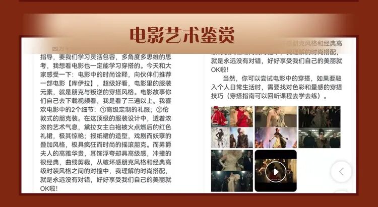 从色彩的搭配到审美的提升,甚至是电影艺术的鉴赏,我们的课程都有涵盖。只要你认真学习,一定能取得长足的进步: