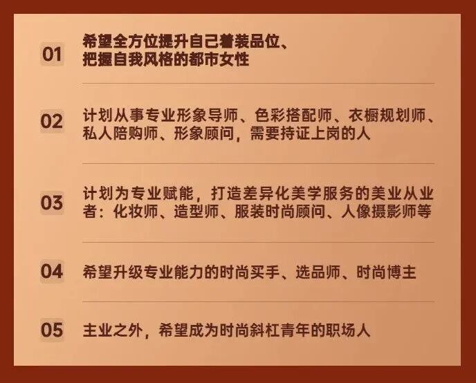 根据《2019全球财富报告》 截至2019年年中,中国有1亿人财富名列全球前10%,这也意味着中国应当有形象管理师从业人数:0.8%*1.6亿=128万。而目前,取得专业形象管理师资格证书,或是正在从业形象管理相关工作的总人数加起来只有1万人,足足有127万的缺口,形象管理师行业就是一片广阔的蓝海领域。形象管理师的日常工作遵循着一套有依据,有成效的原则。他们通过TPO法则,即Time(时间)、Place(地点)、Occasion(场合)为客户选择该穿什么衣服,化什么妆容,还有需要什么等级的礼仪等等。他们也坚信。在人际关系中:语言起到7%的作用,肢体动作起到38%的作用,剩下的55%取决于外表和打扮是否和他的谈吐相衬。随着交际场景的多元化和必要性,越来越多人愿意向形象管理师支付一份“美丽费用”。这份“美丽费用“价格不菲,前段时间,“90后形象顾问陪购师1小时收费1000元”的新闻刷爆朋友圈。但其实行业内1000元并不是时薪最高的收入。在北京、上海等一线,新一线城市,专业的形象咨询或打造是按照20000-30000元/3小时进行收费的。一些大牌形象设计师年收入百万以上。既能让自己变美,同时又有未来可期的收入增长,这是我们特别鼓励大家成为形象管理师的根本原因。如果你不想再荒废掉2022,不想浪费自己生命的每一秒,可以看看我们这些学员是怎样做的:作为一名百万大V博主,梁虹一直想要在形象管理方面进一步提升自己。通过这次学习,她直言自己在服装搭配方面更加自信了。本来就气质很好的梁虹,在参加完课程之后,气场更加坚定,成功女性的气质夺目而耀眼。Ling子从事服装行业,本身在时尚行业有一定的积累,但这次,用她自己的话说,是抱着空杯的心态来填补自己。完成学习后,她一直在接线下的开业活动,线上的直播以及新人的带训。有了完善的知识体系支撑,在面对面的交流中,她给了客户和同事更精准的推荐,专业度进一步提升。新年伊始,我们的第5期《形象管理师认证班》课程,即将在3月15号开课。花费了两位专业导师近十年时间和几十万学费学到的知识和经验,提炼总结为6大版块的精华知识倾囊相授,让你在短短26天时间里就能从0到1,成为一名专业的形象管理师: