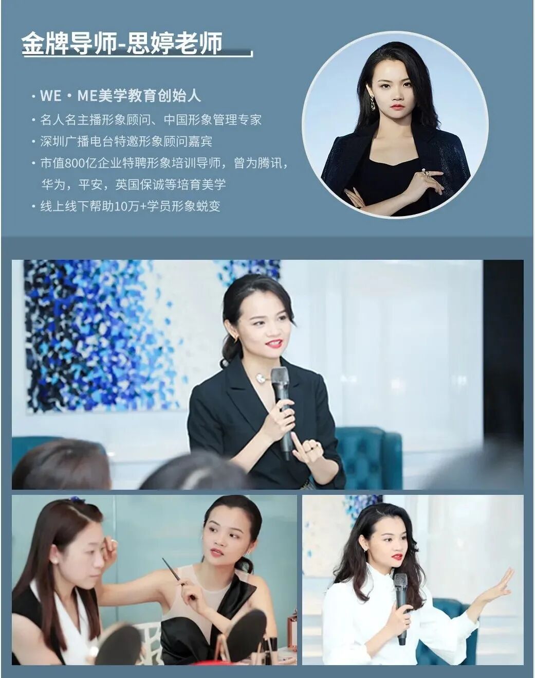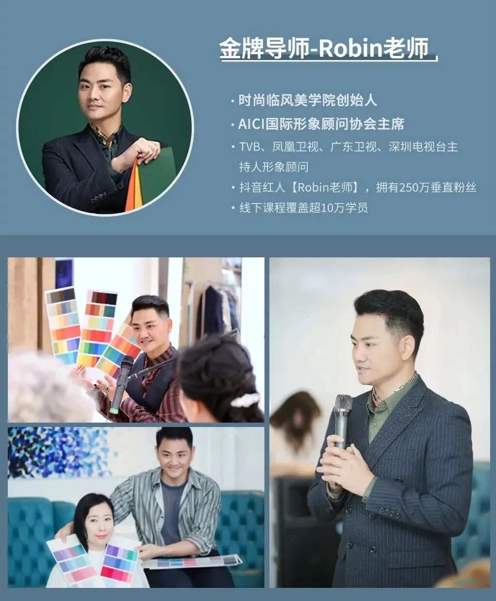 但是知易行难,要想学会一个专业、拥有一个特长,比想象中要难的多得多。不但要有耐心细致的老师,更要有系统的课程、积极的反馈、长期的跟进,才能不辜负自己的负重前行。上文提到的Melinda想要提升自己时,选择的就是我们的《形象管理师认证班》课程。会做出这样的选择,她主要是出于以下几点的考虑:这门课的授课老师,是我们的王牌导师:时尚临风美学院的创始人Robin老师,和WE.ME女性形象成长平台的创始人思婷老师。两位老师金光闪闪的履历,每一条都是花费了几年时间精力和数十万元资金投入,才实现的成就。作为时尚临风的幕后大咖,时尚临风每日推送的内容和视觉效果都是由Robin导师指导把关。出席重大时尚活动这样的重要场合,时尚临风全员的形象打造也都是由Robin导师做调整和确认。他同时还是各大时装周的特邀形象管理顾问和南方航空空乘礼仪培训师。而思婷导师是一位新世纪魅力女性!她一手创立了WE.ME女性成长平台,自己的变美历程就是WE.ME最好的代言。她尤其擅长从形象专业角度告诉学员怎么认识皮肤、五官和身材的特性,教会学员搭配的底层逻辑和正确技巧。从进入这个行业以来,思婷导师已经帮助千万女性,从内而外实现美的蜕变,成为人生赢家。我们的《形象管理师认证班》课程,会从色彩、风格、场合、体型、妆造、搭配等六大模块,进行系统讲解。
