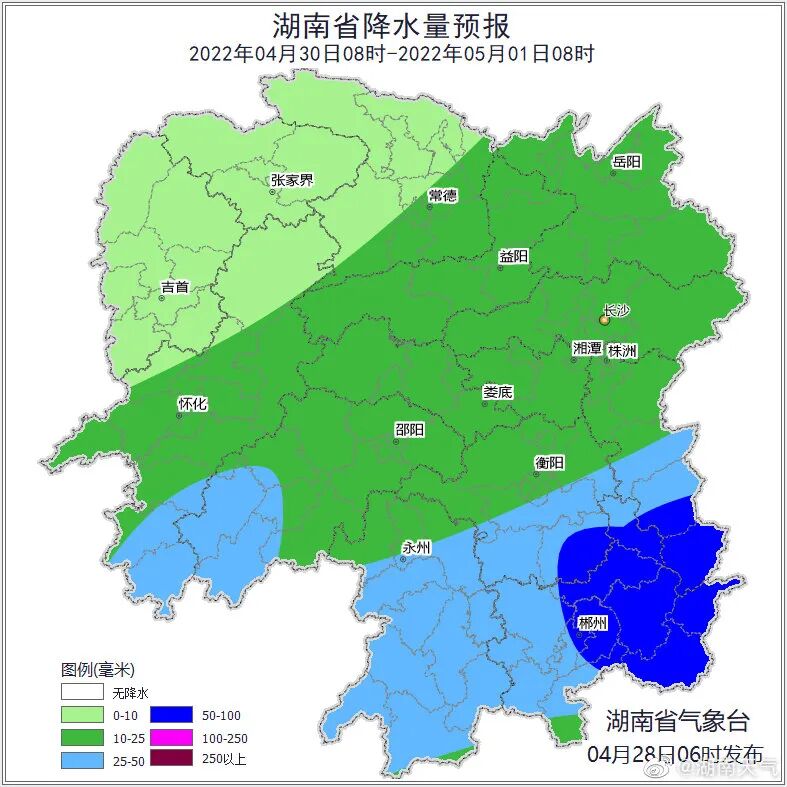 湖南省气象台预计,28日至30日湖南自北向南有强降雨,并伴有短时强降水、雷暴大风、冰雹等强对流天气,最高气温下降至18~20℃;5月1日省内自北向南天气转好,2日至4日以多云间晴天天气为主,早晨局地有雾。