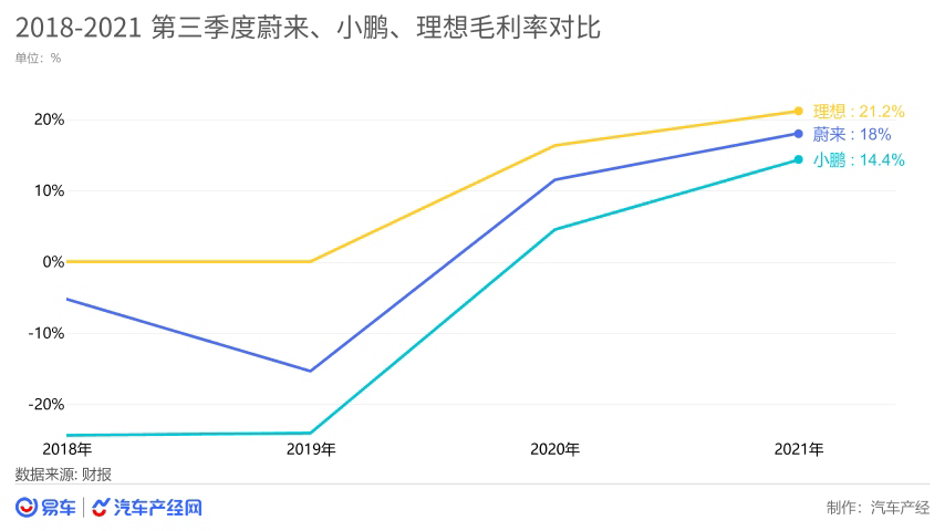 最“抠门”的理想继续保持了最高的毛利率,今年三季度继续攀升到21.1%,这个数字甚至超过了大家眼中最会赚钱车企丰田2020年的表现。蔚来三季度毛利率为20.3%,同比上升7.4%;小鹏汽车三季度毛利率为14.4%,同比上升9.8%。