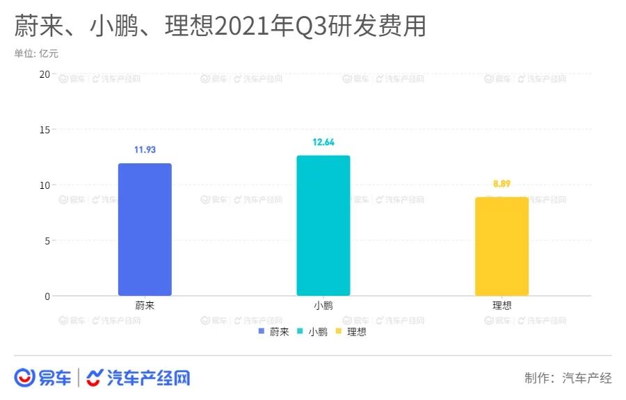 今年三季度,蔚来研发11.93亿元,同比增长101.9%,环比增长35%;理想研发投入8.89亿元;小鹏汽车首次成为第一,研发投入达到12.64亿元,环比增长46.4%。