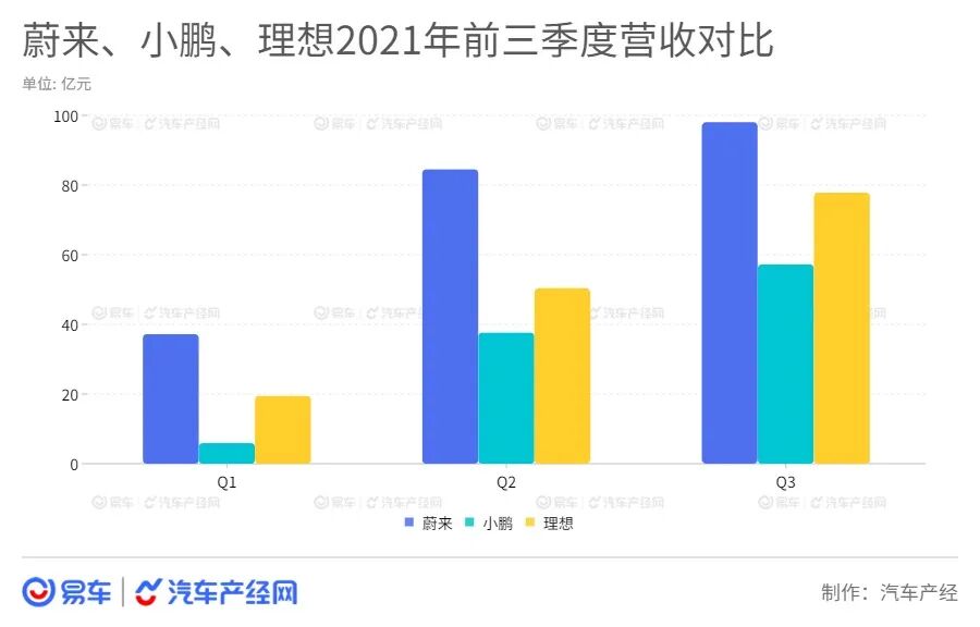 其中,蔚来以98.05亿元的总收入大幅领先于其他新造车势力,同比增幅为116.6%。理想以营收77.8亿元排名第二,同比增长209.7%;小鹏营收57.2亿元,同比增长187.4%,