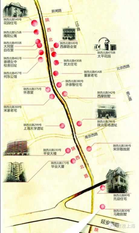 “沿线多为何东公馆、宋家老宅、荣家老宅、马勒别墅等独立式花园住宅,间有华业公寓、太平花园等公寓建筑群落,西摩会堂、怀恩堂等宗教建筑,内含小型戏院的平安大楼等商居两用建筑,展现了老上海公共租界拓界期间社区生活的居住、文化、精神建设状态。”静安区文物保护管理中心负责人对陕西北路如数家珍。
