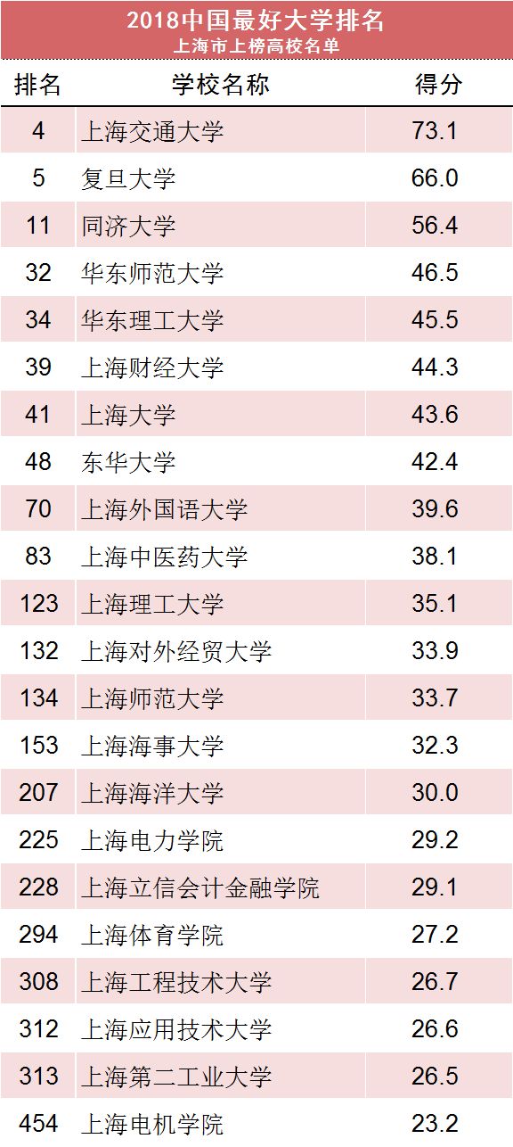 其他入围“中国最好大学”榜单的沪上高校分布在各个区间,从第70名到第454名,包括:上海外国语大学、上海中医药大学、上海理工大学、上海对外经贸大学、上海师范大学、上海海事大学、上海海洋大学、上海电力学院、上海立信会计金融学院、上海体育学院、上海工程技术大学、上海应用技术大学、上海第二工业大学、上海电机学院。
