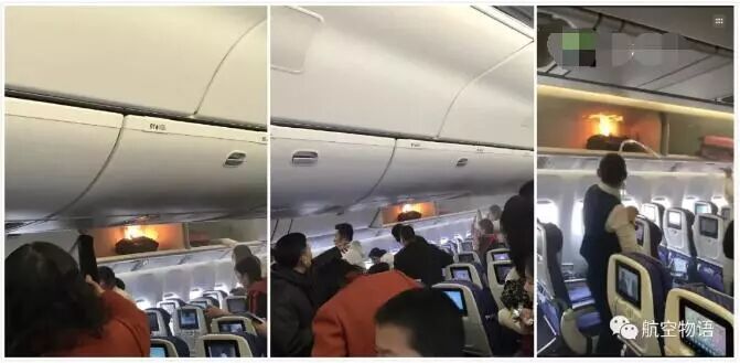 2月25日,中国南方航空一从广州飞往上海的航班在登机时,行李架起火。