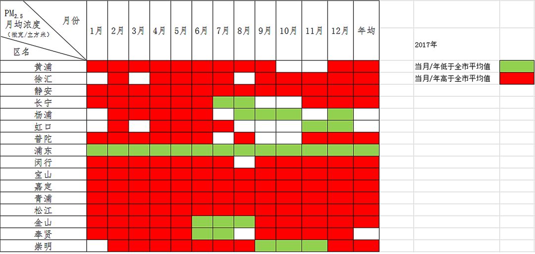 以上海2016年、2017年共24个月的月均PM2.5浓度为参照,将对应月份PM2.5平均浓度高于此水平的区标为红色,将低于此水平的区标为绿色。