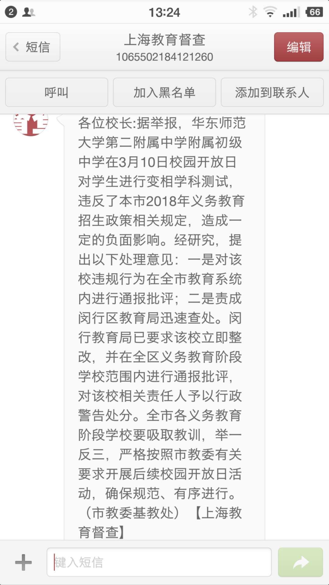 市教委基教处昨晚11时通过上海教育督查平台向全市校长发出短信提醒,表示该校违反了本市2018年义务教育招生政策相关规定,造成一定的负面影响,将对该校违规行为在全市教育系统内进行通报批评,并责成该校立即整改。