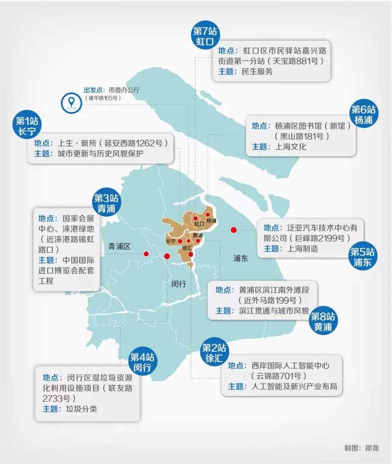 9月6日,李强一行从早上9点出发,一直看到下午6点多,遍及长宁、徐汇、青浦、闵行、浦东、杨浦、虹口、黄浦等区。线路经过精心选择和设计,所到之处,尽最大可能包括了中国国际进口博览会场馆周边区域、新兴产业园区、企业创新研发中心、黄浦江滨江公共空间、历史建筑和风貌街区、市民驿站、垃圾资源化利用设施项目现场等。