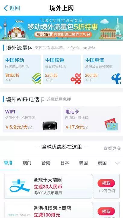 香港很多地方都提供免费WiFi,比如西九龙站内每层楼都有WiFi点。如果你对上网有更高要求,打开支付宝,首页-更多-购物娱乐-出境-境外上网-境外流量包:
